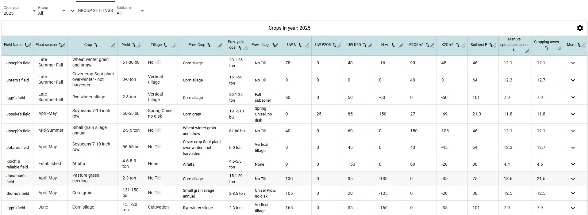 The name of each crop's field is visible by default. For each crop, if a crop was planted in the year before, information about that crop will be visible in the same row.