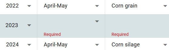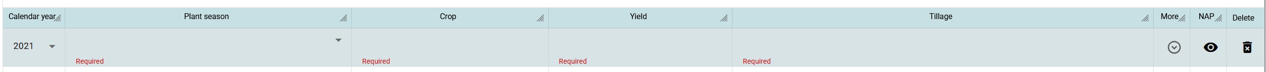 Calendar year: this value will either be the same or one greater than the value in the calendar year column of the crop in the row above. The year will be the same as the crop in the row above if the crop in the row above is planted in the April-May, June, Mid-Summer or Established season. The year will be the calendar year after the crop in the row above if the crop in the row above is planted in Late Summer-Fall.