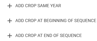+ add crop at end of sequence will automatically create a crop in the calendar year after the current last calendar year in your crop sequence. For example, if the bottom row in the table has calendar year 2028, adding a crop to the beginning of the sequence will put a row on the bottom of the table in calendar year 2029