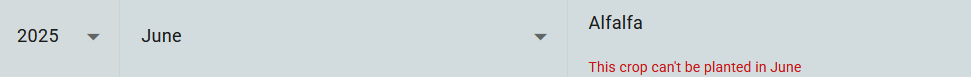 In this case, there was Established alfalfa planned in 2025. Things changed, and something got planted in June instead. SnapPlus then displays an error message indicating that the alfalfa crop is not valid after changing the planting season to June