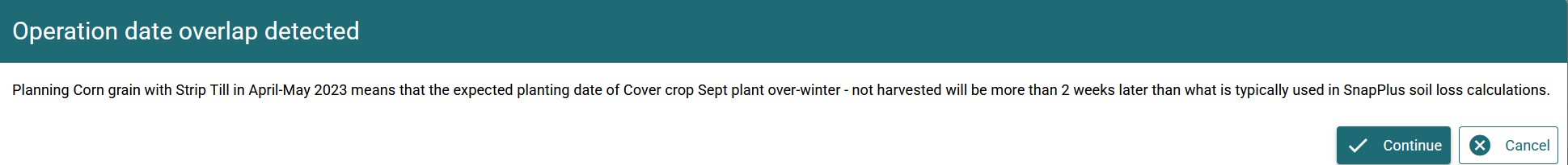 Sometimes the data in a nutrient management plan needs some extra pre-processing to serve as input for soil loss modeling (and so, to calculate soil loss). One common situation is that crop data is set up in a plan where the dates of operations (planting, cutting, tilling etc.) don't exactly match the dates that are assumed by soil loss models. In this case, SnapPlus will display a message when the data is saved: