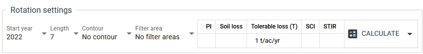 Below these dropdowns you will find a row of controls that will allow you to set up a crop rotation and view information about the projected soil loss on the chosen field: